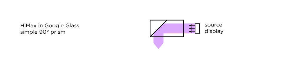 Most people remotely familiar with smartglasses have a general understanding of the display used in Google Glass, it is pretty basic: a micro-display (in this case a LCoS) is housed in the electronics attached to the side, and is pointed into a single prism that turns the light 90° into the upper-right-hand field-of-view of the wearer — in this case, a combined optical unit, housing both the LCoS display and the prism optics, supplied by HiMax (an optics OEM out of Taiwan).