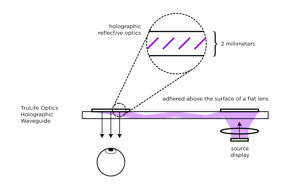 For holographic waveguides, a similar method is employed — a thin-film photopolymer is exposed with laser light to embed microscopic nano-scale holograms of mirror-like optics embedded within the lens, replacing the role of prisms in more traditional waveguides. Much as before, a micro-display is projected into one end of the lens, the hologram optics turn the light, guiding the unidirectional light-wave through the surface, and another set then turns the light back towards the eye. This remarkable feat of engineering is accomplished within a fraction of the thickness employed in prism-based waveguides.