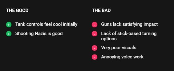 There are other weird elements too, like enemies simply popping up out of thin air, or appearing in places where they simply shouldn’t be able to be. I’m happy to suspend my disbelief for games, but this random Nazi just literally teleported into cover before firing a rocket at me, and that feels cheap. It is, quite simply, not fun. It would be fine if it felt good to shoot things, but it doesn’t.