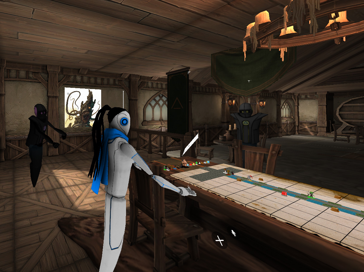 I am writing this from VR in a dimly lit tavern with a fire crackling behind me. Vaguely medieval music adds ambiance. Four people plus the dungeon master are playing a tabletop Dungeons & Dragons game in a room adjoining the tavern. I lean in close to examine the pieces on the table.