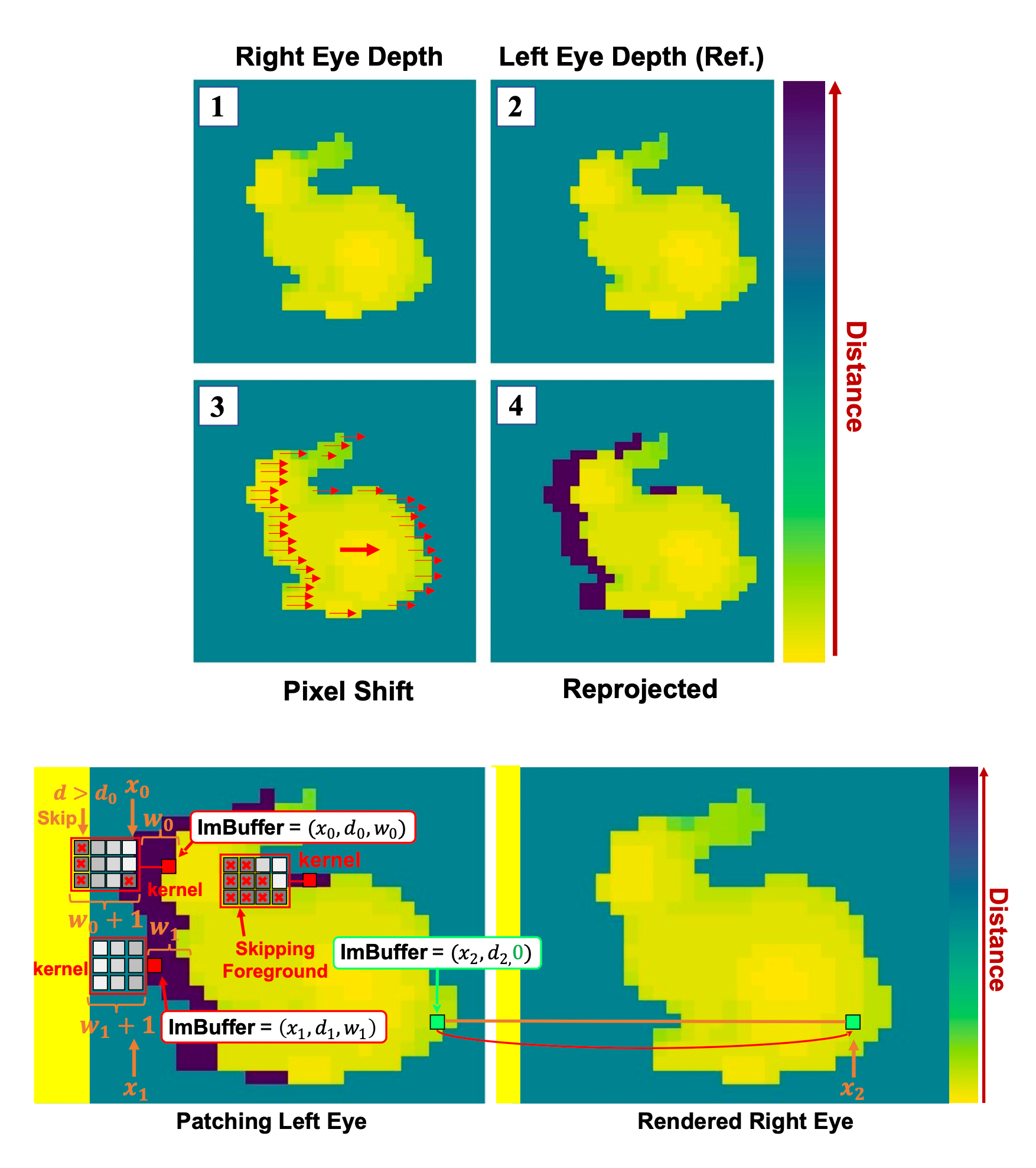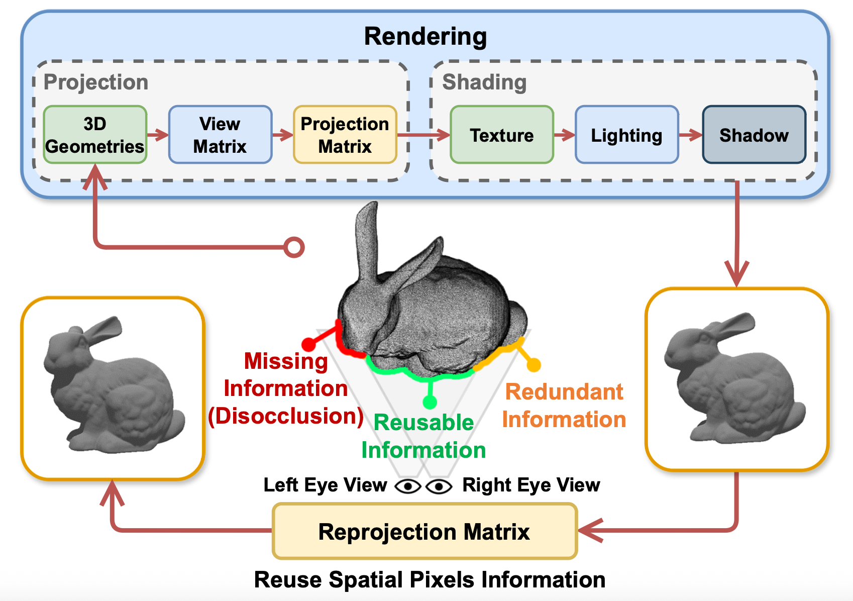 The Reprojection stage uses a compute shader to shift every pixel from the rendered eye into what would be the other eye's screen space. It then marks which pixels are occluded, ie. not visible from the rendered eye.