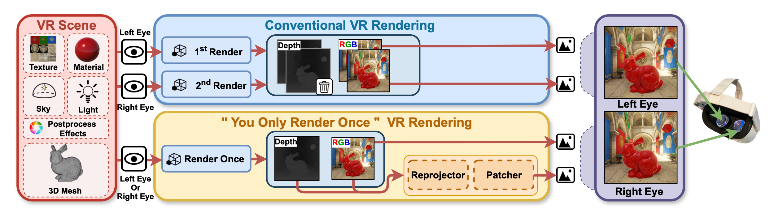 You Only Render Once (YORO) is a fascinating new approach. It starts by rendering one eye, as usual. But instead of rendering the other eye's view at all, it efficiently synthesizes it through two stages: Reprojection and Patching.