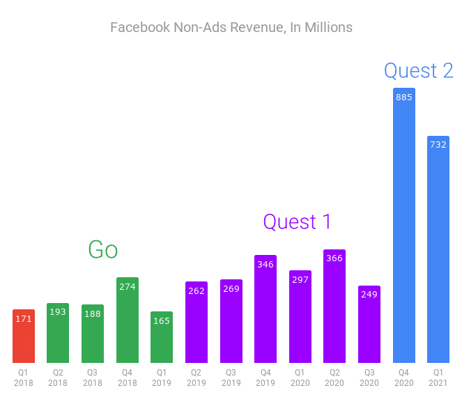 Facebook’s Q1 2021 non-ads revenue was 2.5x that of Q1 2020, continuing a trend that CFO David Wehner described to investors as “driven by continued strong Quest 2 sales”.
