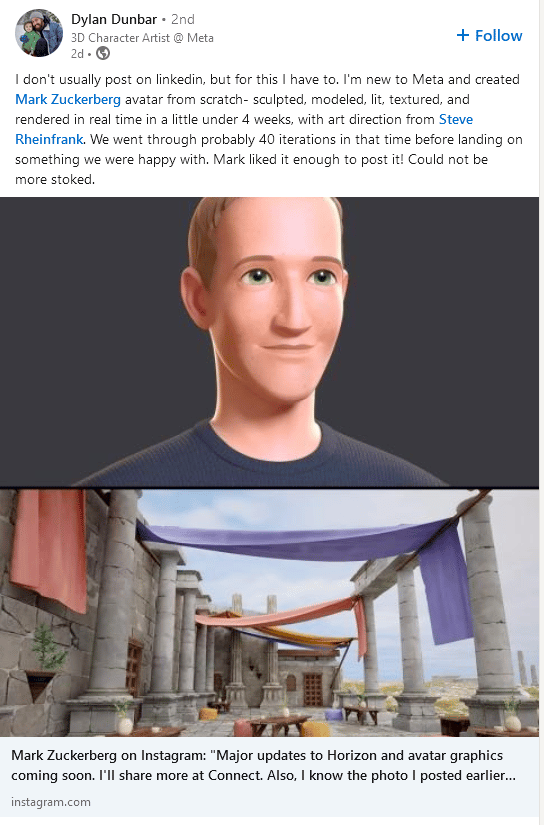 But a LinkedIn post reveals this was proof-of-concept tech art rather than a screenshot of a new avatar system. It was made by Meta 3D Character Artist Dylan Dunbar. Dunbar described creating Zuckerberg’s new avatar “from scratch”.